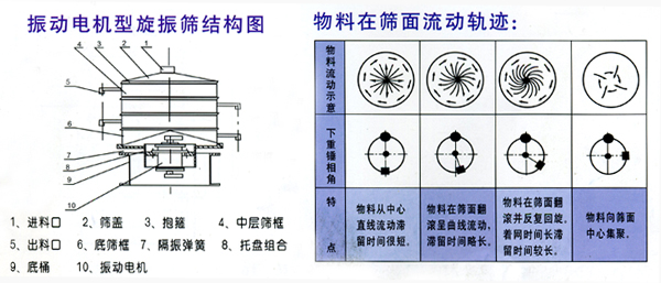 S49振動電機旋振篩是通過立式振動電機直接傳動,使篩體產生復旋型振動,此振動軌跡為—復雜的空間立體曲線,從而使篩體產生篩分作用。調節(jié)上下重錘的空間相位角,可以改變物料在篩面上的運動軌跡。
